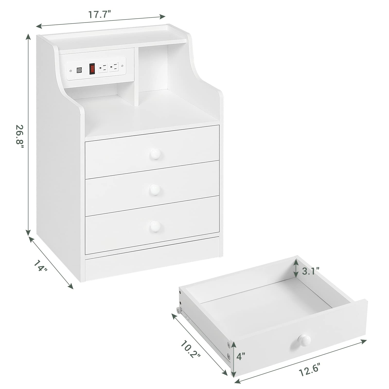 Amazon Com Tiptiper Nightstand With Charging Station Night Stand With 3 Storage Drawers Bedside Table With Hutch Modern End Side Table For Bedroom White 14d X 17 7w X 26 8h In Home Kitchen